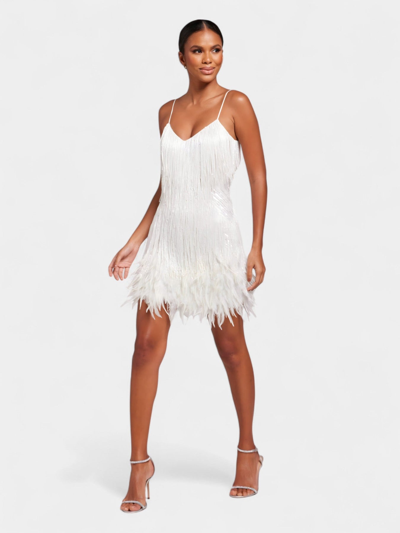 Make an unforgettable entrance in the Alira Mini Dress, a statement piece made for spotlight moments. Drenched in white hand-embellished crystal beadwork and finished with a soft feather hem, this dress shimmers with every step. Its curve-contouring design and plunging neckline bring ultimate glamour, perfect for high-gloss events and celebrations that call for all eyes on you.