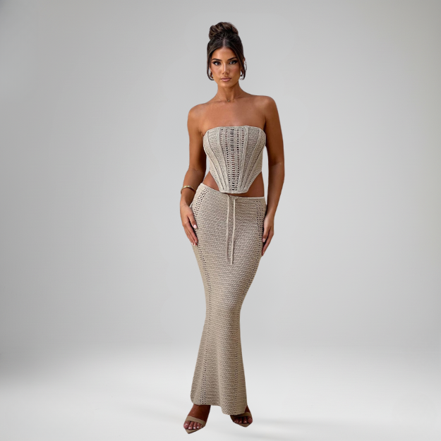 Embrace effortless elegance with the Soleil Knit Set, a dreamy two-piece designed for sun-soaked days and balmy nights. Featuring a structured knit corset top with intricate detailing and a flattering cut-out waist, this set is both sultry and sophisticated. The matching high-waisted maxi skirt drapes beautifully, hugging your curves while offering a relaxed, breathable fit.