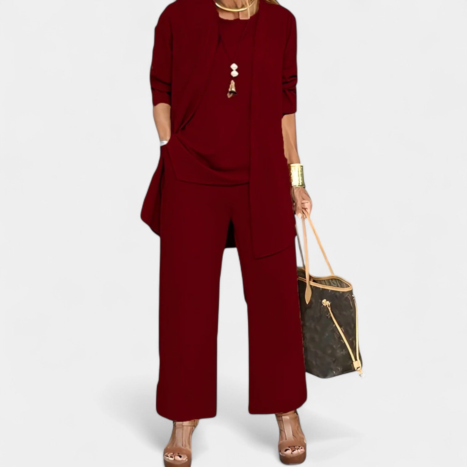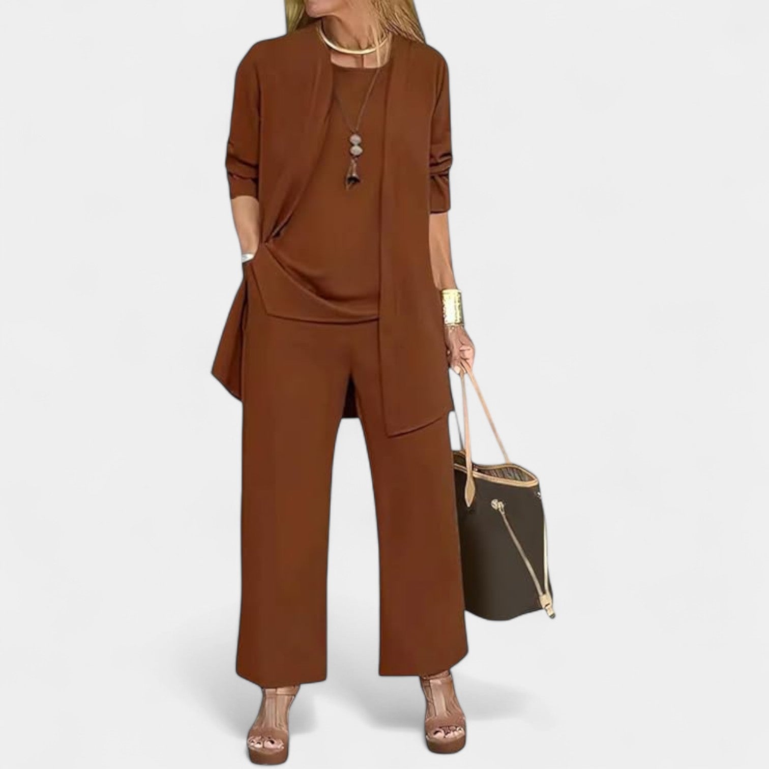 Refresh your wardrobe with the understated elegance of the Amethyst Set — a coordinated trio designed to keep you polished and comfortable from morning to evening. Featuring relaxed trousers, a sleeveless top, and a flowing open-front cardigan, it’s the perfect blend of ease and sophistication. Ideal for casual lunches, weekend getaways, or effortless work-to-evening transitions.
