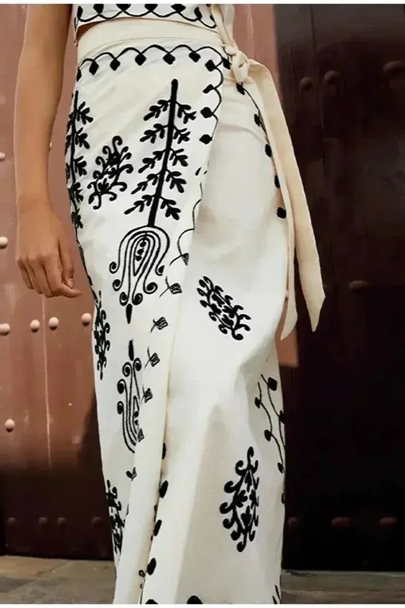 The Santorini Embroidered Set blends sophistication and artisanal charm, creating a refined yet effortless look. Featuring a delicately embroidered crop top with flutter sleeves and a wrap-style midi skirt, this two-piece ensemble is perfect for vacations, summer events, or elevated casual wear.